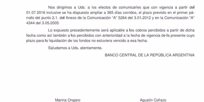 El BCRA comunica la COM A 6003 CAMEX – 1. 768 que con vigencia a partir del 1 de Julio de 2016 inclusive se ha dispesto ampliar a 365 días corridos, el pazo previsto en el primer párrafo del punto 2.1 del Anexo de la COM A 5264 del 3 de Enero de 2012 y en la COM A 4344 del 3 de Marzo de 2005. Lo expuesto precedentemente será aplicable a los cobros percibidos a partir de dicha fecha como así también lo percibido con anterioridad a la fecha de vigencia de la presente cuyo plazo para la liquidación de fondos no estuviera vencido a esa fecha.