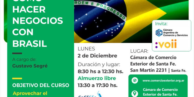 El próximo 2 de diciembre en la Cámara de Comercio Exterior de Santa Fe se desarrollara una capacitación dirigida por Gustavo Segre, quien abordara distintas temas sobre Como hacer negocios con Brasil.