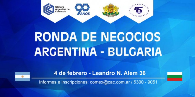 Organizada por la Cámara Argentina de Comercio, la Embajada de Bulgaria en Argentina y la Cámara de Comercio e Industria de Bulgaria, el 4 de febrero desde las 9:45hs. se desarrollará en el Salón de Actos del 8º piso de la CAC (Alem 36), la Ronda de Negocios Argentina – Bulgaria.