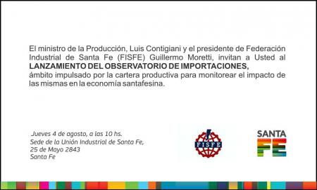 En el día de hoy a las 10 hs. en la sede de la Unión Industrial de Santa Fe, sita en 25 de mayo 2843 de la ciudad tendrá lugar el Lanzamiento del Observatorio de Importaciones, ámbito impulsado por la cartera productiva para monitorear el impacto de las mismas en la economía santafesina. Invitan: Ministerio de la Produccción de Santa Fe y Federación Industrial de Santa Fe (FISFE).